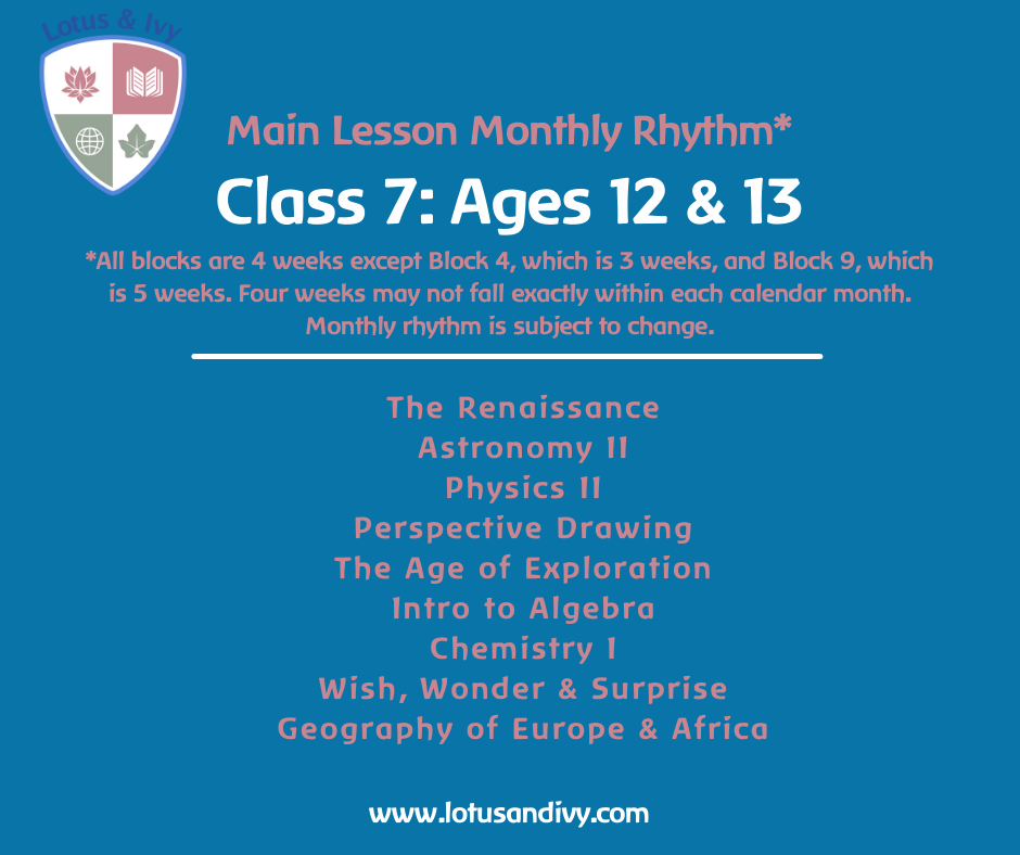 Lotus & Ivy’s Main Lessons and homework, when completed, fulfill a complete year homeschool requirement for language arts, science, and social studies. For a complete math curriculum, we recommend Lotus & Ivy’s Math Classes. For more information about our Class 7 Math Classes, click here.